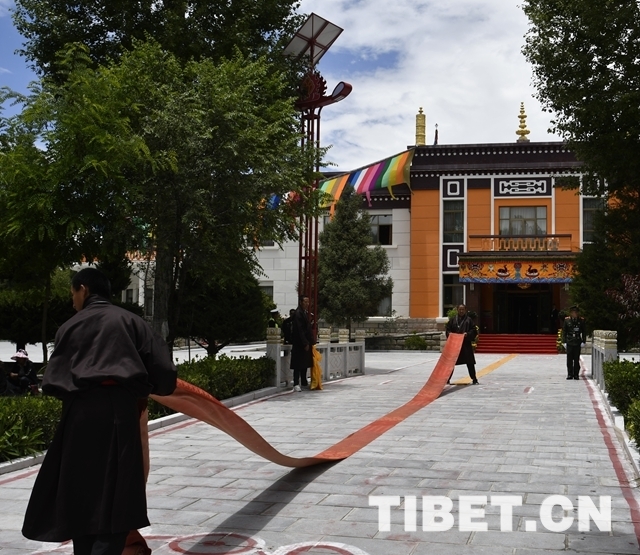 在位于拉薩市區(qū)的班禪行宮雪林多吉頗章主殿前,僧人們提前繪制了金剛結等吉祥圖案,一條尺許寬的地毯從歡迎隊伍處一直延伸到主殿門前。