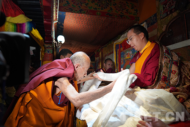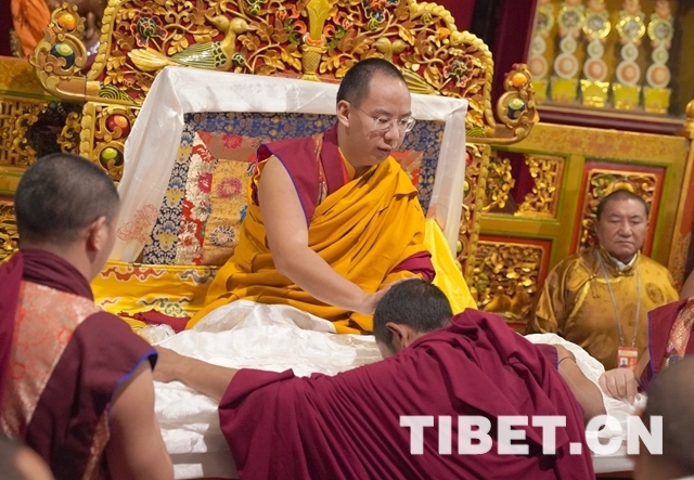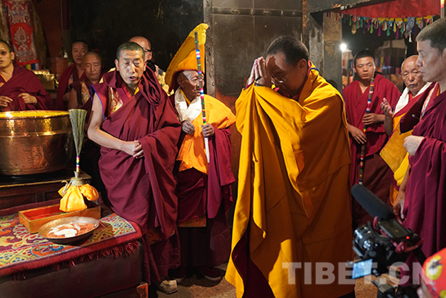 下午,十一世班禪登上拉讓日光殿寶座,接受扎什倫布寺管委會僧人成員、高僧的朝拜,為他們摸頂賜福,并帶領高僧集體誦經祈禱。
