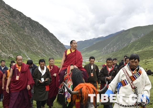 在眾人簇擁下騎著牦牛的十一世班禪。攝影:王淑