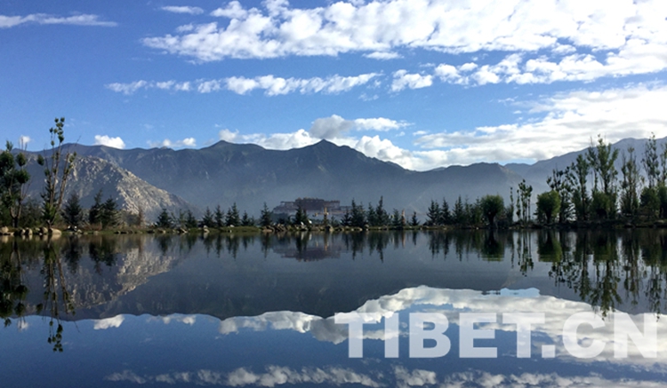 1)步入鵬矗生態(tài)園,沿著游步道緩緩前行,十一世班禪在布宮鏡湖景點稍作停留。此時,微波蕩漾的湖面雖未將神圣而莊嚴的布達拉宮映入畫卷,但從遠處觀賞,也另有一番景致。十一世班禪拿出手機、俯下身子,將眼前的布達拉宮記錄下來。