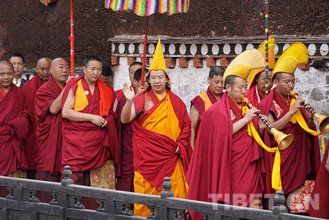 十一世班禪面帶笑容,在眾高僧的簇擁下,向兩旁的信眾頷首微笑、招手致意,緩步進入主殿。