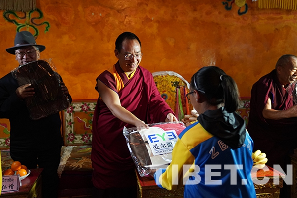 十一世班禪為學生代表捐贈愛心書包。攝影:王淑