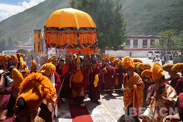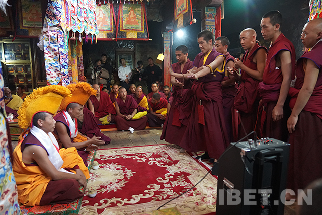 十一世班禪在達(dá)布夏珠林寺觀看僧人辯經(jīng)。攝影:王淑