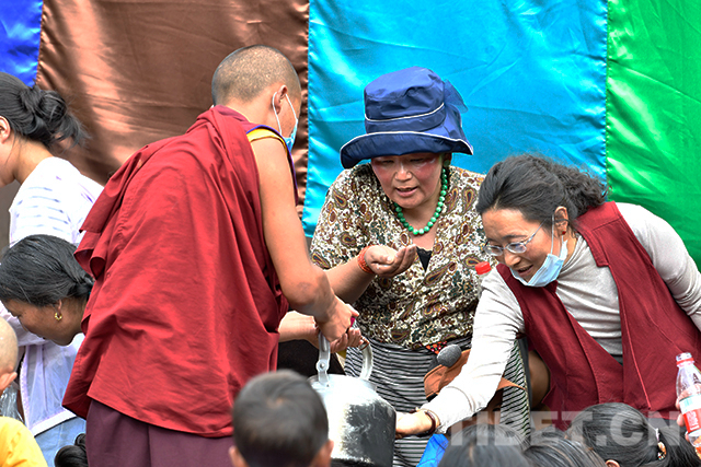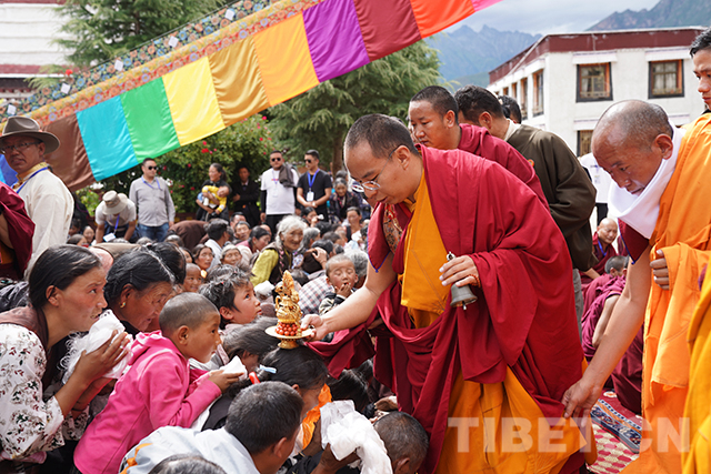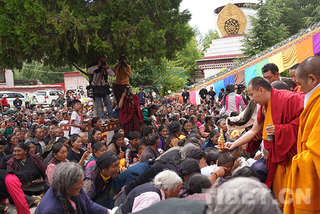 僧人向信眾分發(fā)十一世班禪加持過的圣水和圣果。攝影:扎西