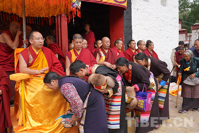 考察結(jié)束后,十一世班禪不顧路途勞頓,稍事歇息便前往達(dá)布夏珠林寺朝拜并為當(dāng)?shù)厣仔疟娕e行長壽灌頂。由手持香爐和吹嗩吶的僧人引領(lǐng),在手持黃傘的僧人護(hù)送下,十一世班禪步入達(dá)布夏珠林寺杜康殿朝拜。朝拜后,他登上法臺,領(lǐng)誦經(jīng)文并微笑接過寺廟僧人虔誠捧上的曼扎等供奉,為他們摸頂賜福、發(fā)放布施。