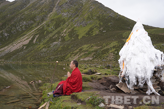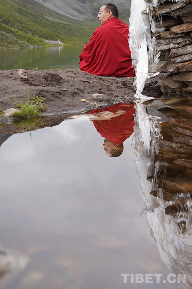 十一世班禪在圣湖邊祈禱。攝影:王淑