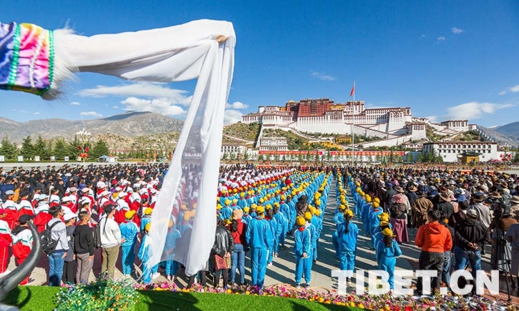 上午10時,伴隨著《義勇軍進行曲》,五星紅旗在各族群眾的齊聲歌唱中緩緩升起。飄揚的五星紅旗下,雪域高原一派生機盎然的景象。在中國共產(chǎn)黨的領(lǐng)導下,雪域高原的面貌日新月異,昂首闊步走在社會主義康莊大道上,處處呈現(xiàn)出經(jīng)濟發(fā)展、社會進步、文化繁榮、民生改善、民族團結(jié)、宗教和睦、人民安居樂業(yè)的喜人局面。