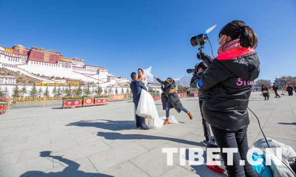 冬日的布達(dá)拉宮廣場上,身著盛裝的市民群眾三三兩兩的有說有笑;前來旅游的游客拉著行李箱漫步其中;不畏嚴(yán)寒拍攝婚紗照的新人露出甜蜜的笑容。
