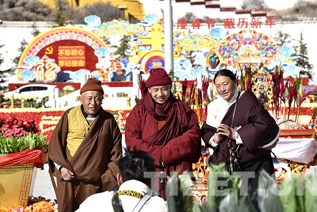 隨著工作人員按照規(guī)劃有序地將仿真花卉和絹花擺放,布達(dá)拉宮廣場上,藏漢雙語的“歡度春節(jié)藏歷新年”字樣逐漸成型。待巨大的切瑪盒擺放到位后,工作人員在切瑪盒兩側(cè)分別放入青稞和剛剛炒制出的糌粑,隨后插上綻放在新年里的“羅薩梅朵”,裝扮布達(dá)拉宮廣場。