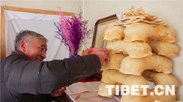 圖為索朗旺堆老人正在擺新年“疊噶”。
