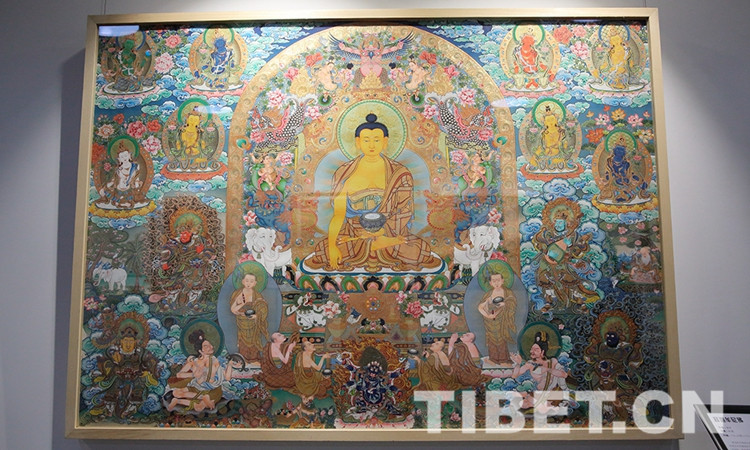 展覽共展出中國工藝美術大師、國家非物質文化遺產項目代表性傳承人娘本、以及其弟子參與創(chuàng)作的唐卡作品25幅。圖為娘本唐卡作品《釋迦摩尼佛》。攝影:楊月云