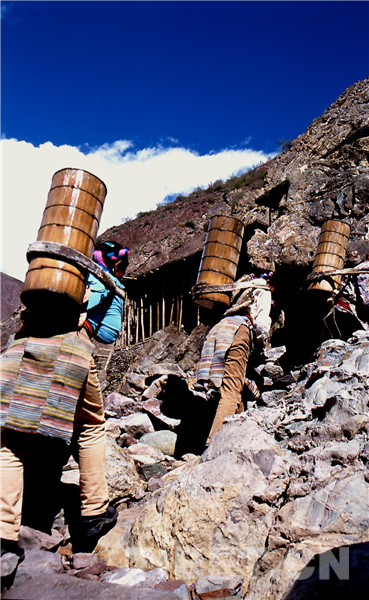 鹽田里的事自古就是由女人操持的,按她們的解釋是因?yàn)槟腥舜中?,?huì)弄臟了白花花的鹽,賣不出好價(jià)去。所以男人就負(fù)責(zé)運(yùn)輸和銷售工作,他們會(huì)在女人已經(jīng)曬出小山樣的一堆鹽巴時(shí),趕著騾馬來(lái)把鹽馱走,然后跋山涉水到巴塘、德欽、昌都一帶,換錢糧或者茶葉。而女人就用自己的雙肩背起水桶,下到陡峭的江邊汲水,再沿著細(xì)小的棧道背到用木支架撐起的鹽田里,等無(wú)數(shù)桶鹵水將鹽田灌滿后,剩下的就是盼著陽(yáng)光和風(fēng)快快將水分蒸干,第二天就可以收獲了。她們就這樣日復(fù)一日年復(fù)一年地將狹窄的山路踩踏了千萬(wàn)遍。