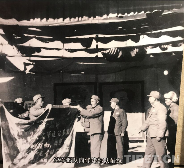 圖為空軍部隊向修建部隊獻(xiàn)旗。 翻拍:龍真多吉