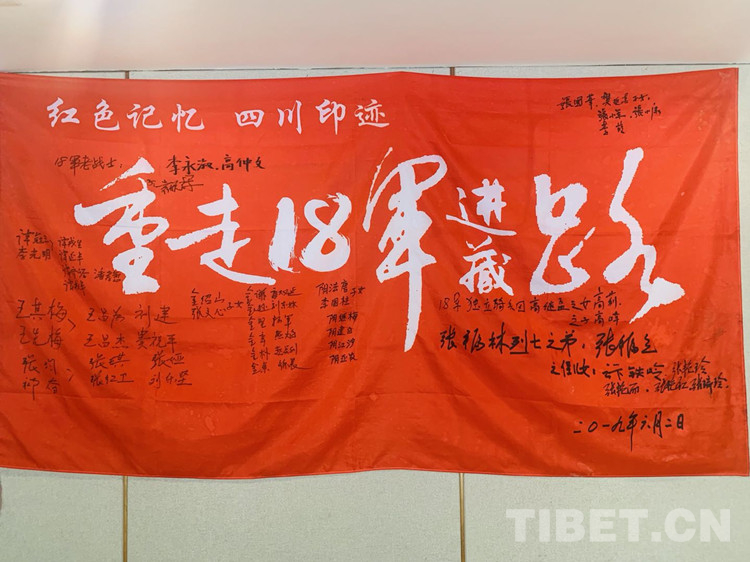 圖為十八軍老戰(zhàn)士及十八軍后代在“重走十八軍進(jìn)藏路”隊(duì)旗上簽字留念。