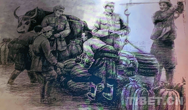 圖為甘孜人民自發(fā)捐助食、布匹。圖片翻拍于朱德總司令和五世格達(dá)活佛紀(jì)念館。