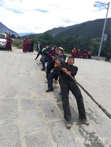 開展拔河比賽活動(dòng)。由統(tǒng)戰(zhàn)民宗、工商聯(lián)干部、寺廟僧尼、珠曲登村村民、簡切村村民分別組成4支參賽隊(duì)伍,他們揮灑著汗水,在隊(duì)員們的加油鼓勁聲中賽出了力量,賽出了精神。