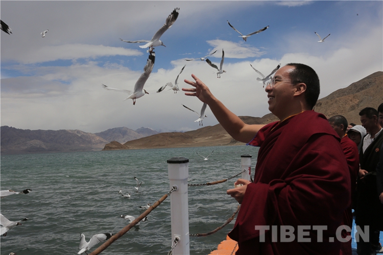 7月26日,十一世班禪觀覽班公湖,考察生態(tài)保護(hù)情況。置身于藍(lán)天綠水和湖光山色中,觀看鳥兒展翅飛翔和低空盤旋,聆聽美妙的鳥鳴聲,讓人感受到人與自然、與動(dòng)物和諧相處的溫馨場(chǎng)景。