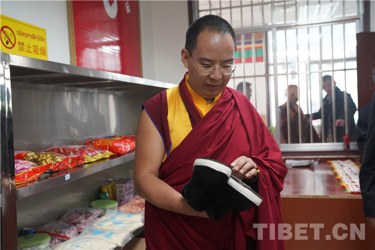 圖為十一世班禪在阿里地區(qū)“雙集中”供養(yǎng)中心小超市了解商品質(zhì)量 攝影:王淑