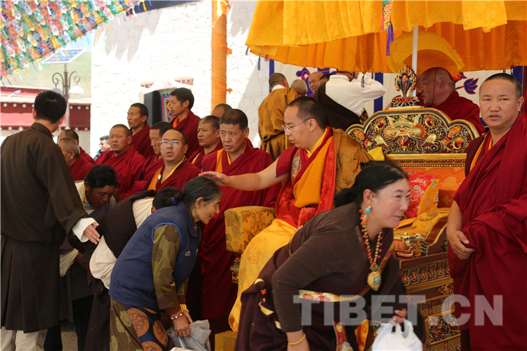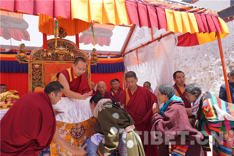 得知十一世班禪要來,草原上的信教群眾把家中最華貴的衣服都穿在了身上。摸頂中,有信眾請(qǐng)十一世班禪吹一吹眼睛或撫摸傷痛處,十一世班禪總會(huì)盡心滿足。