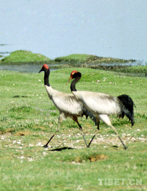 圖為一對在色林錯國家級自然保護區(qū)湖邊漫步的黑頸鶴(唐召明2001年攝)
