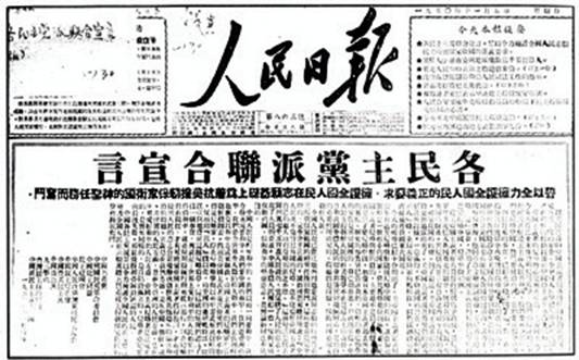 1950年11月4日,中國共產(chǎn)黨與各民主黨派發(fā)表聯(lián)合宣言:“誓以全力擁護(hù)全國人民的正義要求,擁護(hù)全國人民在志愿基礎(chǔ)上,為著抗美援朝,保家衛(wèi)國的神圣任務(wù)而奮斗。”圖為《人民日報(bào)》刊載的《各民主黨派聯(lián)合宣言》 圖片來源:人民網(wǎng)