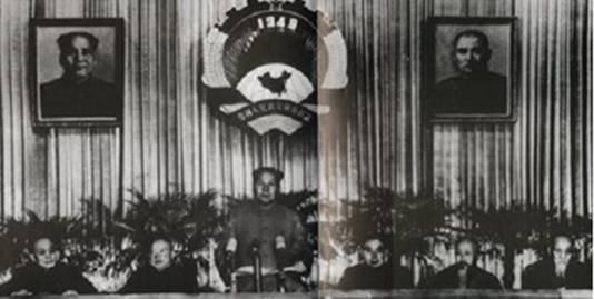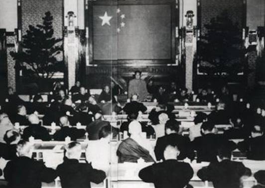 1954年12月21日,全國政協(xié)二屆一次會(huì)議在京舉行。會(huì)議修改了政協(xié)章程。圖為大會(huì)主席臺(tái)。左起:郭沫若、李濟(jì)深、毛澤東、周恩來、沈鈞儒、陳叔通 圖片來源:人民網(wǎng)