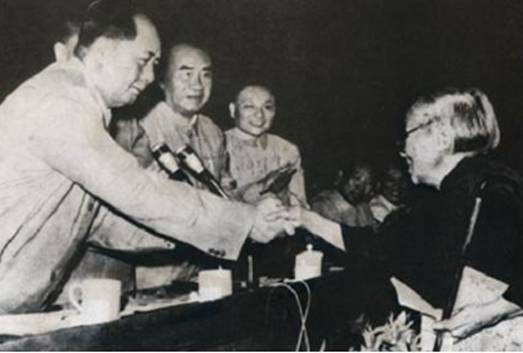 1961年7月1日,在慶祝中國共產(chǎn)黨成立40周年紀(jì)念會(huì)上,何香凝代表各民主黨派、無黨派民主人士、工商聯(lián)獻(xiàn)詞。圖為講話后,毛澤東和她握手 圖片來源:人民網(wǎng)