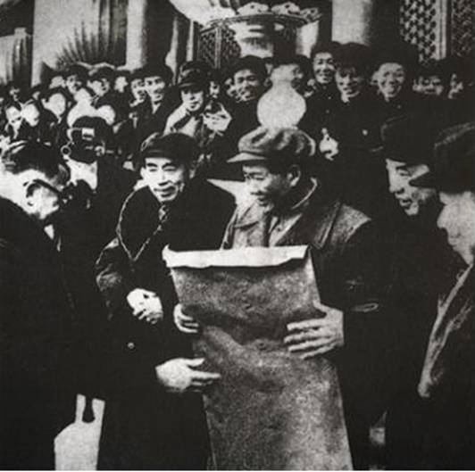 圖為1956年1月15日,北京市實(shí)現(xiàn)全行業(yè)公司合營,民建中央常委樂松生代表北京工商界在天安門城樓向毛澤東主席報(bào)喜 圖片來源:人民網(wǎng)