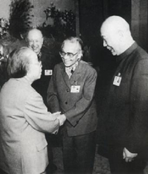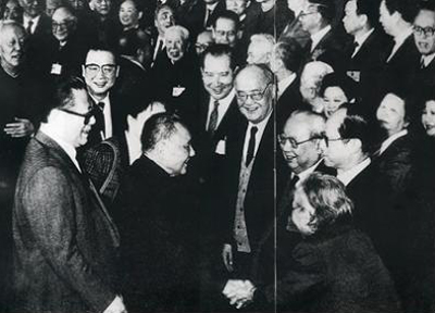 1990年2月,鄧小平、江澤民、李鵬、萬里會見香港基本法起草委員會全體委員時(shí),與參加委員會的雷潔瓊、費(fèi)孝通等握手。各民主黨派有數(shù)十位專家、學(xué)者分別參加了香港和澳門基本法起草委員會,為貫徹“一國兩制”方針和香港、澳門回歸祖國做了許多工作 圖片來源:人民網(wǎng)