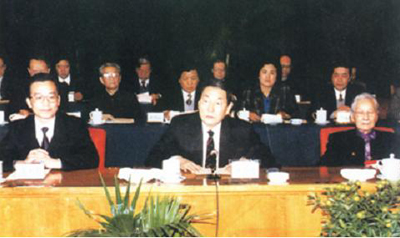 1995年12月,中共中央政治局常委朱镕基代表中共中央出席中國民主促進(jìn)會成立50周年大會并致賀詞。圖為大會主席臺,前排左起:溫家寶、朱镕基、雷潔瓊 圖片來源:人民網(wǎng)(中國西藏網(wǎng) 綜合/孫健 吳建穎)