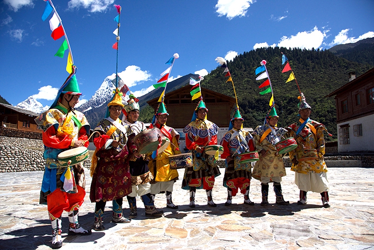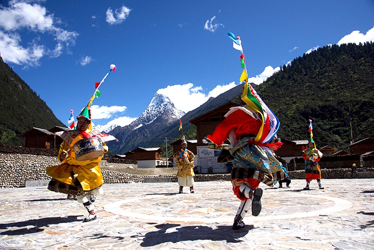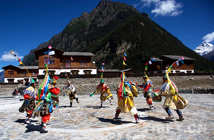 中國西藏網(wǎng)訊 伴隨著一陣整齊的鼓點(diǎn),西藏自治區(qū)林芝市工布江達(dá)縣錯(cuò)高鄉(xiāng)錯(cuò)高村的8位村民開始了梗舞表演。他們的身后是新建成的極具工布地方特色的二層民居,更遠(yuǎn)處是巍峨聳立的杰青那拉嘎布雪山。