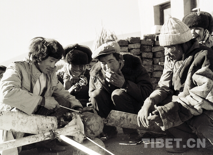 圖為那曲科委風(fēng)能實(shí)驗(yàn)站技術(shù)工人余和平(左一)在嘎措鄉(xiāng)為牧民維修風(fēng)力發(fā)電機(jī)。(唐召明1988年11月24日攝)