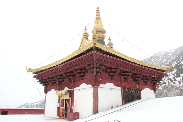 大殿三層為石頭壘的墻,墻體抹白色,稱為“白殿”。殿頂飾以飛檐金頂,呈飄逸升騰之勢,殿頂正中豎有巨大的金頂寶珠,直指蒼穹。圖為查杰瑪大殿的“白殿” 攝影:李元梅
