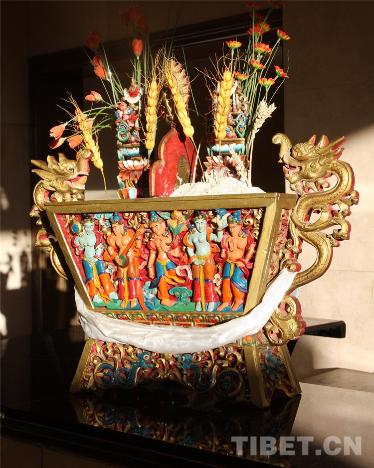 藏歷1月1日,是藏族人民一年一度最重要的節(jié)日。在拉薩,從藏歷12月初開始,我的鄰居們就開始打掃衛(wèi)生、準備年貨了,其中,木雕彩繪的精致方斗“切瑪”和一些面粉制作的點心是每家必備的供品?!扒鞋敗眱?nèi)裝滿酥油拌好的糌粑、炒熟的青稞和人參果等食品,上面插上青稞穗、雞冠花,有的還要撒上酥油做的彩花板。同時,供品的旁邊還要擺放一個彩色酥油花塑的羊頭,到了初一那天,再將提前浸泡長出兩寸青苗的青稞種子擺于佛龕茶幾之上。這些擺設表達著對新的一年風調(diào)雨順、農(nóng)牧業(yè)獲得豐收祈愿。