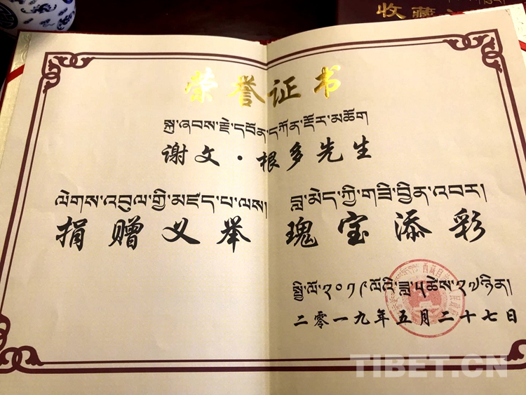 圖為2019年5月,謝文?根多獲得的榮譽證書 攝影:王媛媛