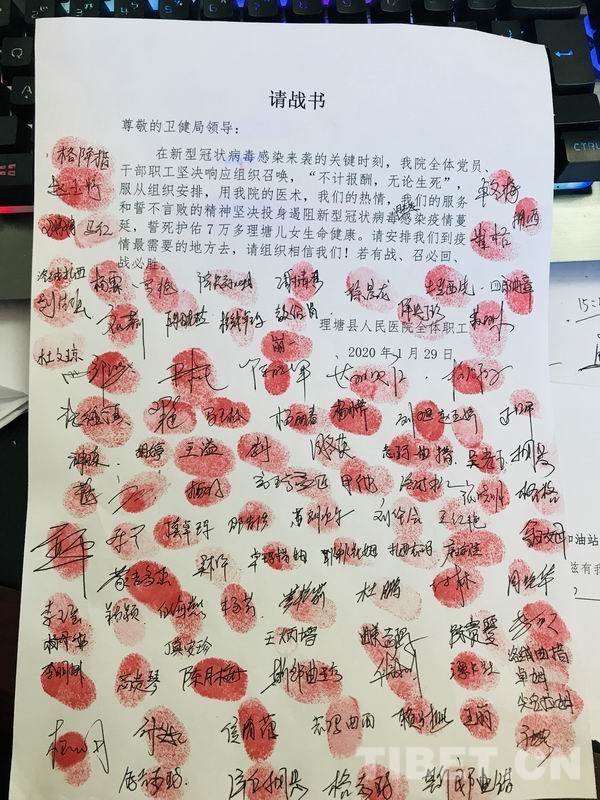 中國西藏網(wǎng)訊 “請安排我們到疫情最需要的地方去,請組織相信我們!若有戰(zhàn),召必回,戰(zhàn)必勝?!?月29日,理塘縣人民醫(yī)院100余醫(yī)護(hù)人員在一份集體請戰(zhàn)書上莊嚴(yán)簽名。