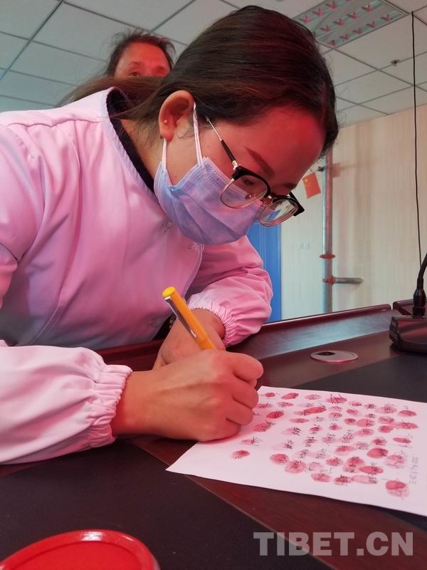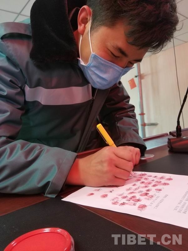 圖為理塘縣人民醫(yī)院醫(yī)護(hù)人員在請戰(zhàn)書上莊嚴(yán)簽名 攝影:格卓瑪