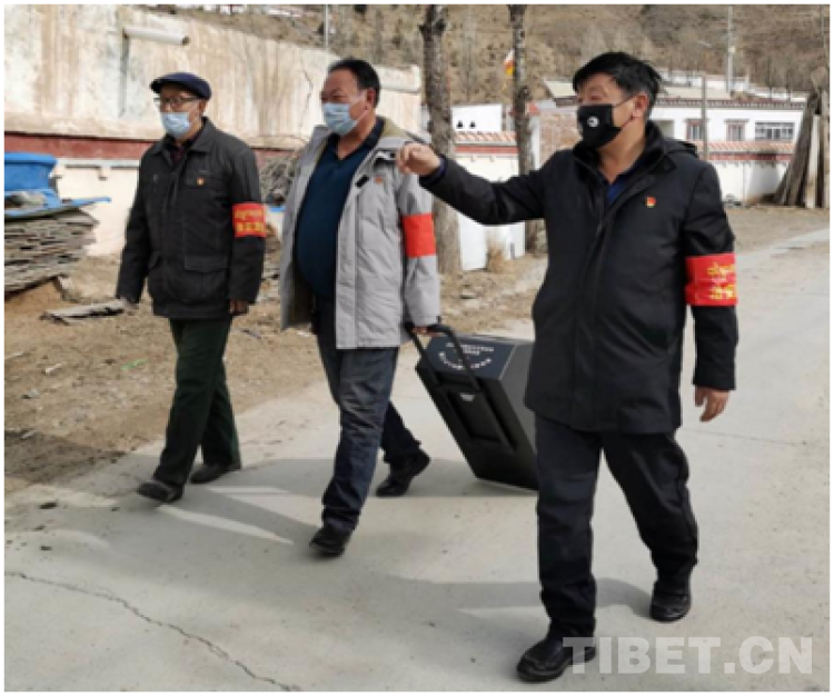 代格村黨支部書記格來達(dá)杰直人快語,他說:“組織上交給我們的任務(wù)就是把本村的群眾保護(hù)好,禁止外來人員進(jìn)入。我們村的全體村民對防控疫情工作全力支持配合。全村除6人因病重、喪事外,無一人出村。大家都自覺停止了探親訪友、聚會(huì)、轉(zhuǎn)經(jīng)和串門。”格來才仁介紹:“代格村設(shè)有4個(gè)卡點(diǎn),2個(gè)固定卡子和2個(gè)流動(dòng)卡子。固定卡子實(shí)行24小時(shí)值守,任務(wù)是對外來人員進(jìn)行勸返和本村人員進(jìn)入時(shí)的消毒工作。負(fù)責(zé)流動(dòng)卡子人員在村內(nèi)拉著多功能音響設(shè)備進(jìn)行‘小喇叭’宣傳和消毒工作。