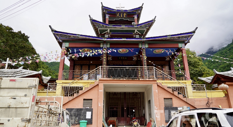 村口正在修路,一條窄窄的小道往山上攀升,3公里后就見到了村子。奇怪的是,村子里一個人也見不著,我們將車停下,正準備下來四處看看,忽然上方傳來整齊的誦讀聲,抬頭一看,我們停車的地方立著一棟中式的仿古建筑,上面掛著一塊豎匾,上書:天主堂。一看日子,今天是星期天,村民們都在教堂做禮拜呢!輕輕地上樓,教堂的大門敞開著,幾十位村民坐在里面,誦讀著圣經(jīng)。我們靜靜地聽了一會兒,他們開始唱詩,歌詞聽不懂,甚至聽不出是哪種語言。唱完之后村民們突然紛紛站起來,彼此微笑,開始與身邊的人緊握雙手。把身邊夠得著的人的手都握一遍后,又恢復了安靜。我們在后面看得出神,被那種祥和感動。