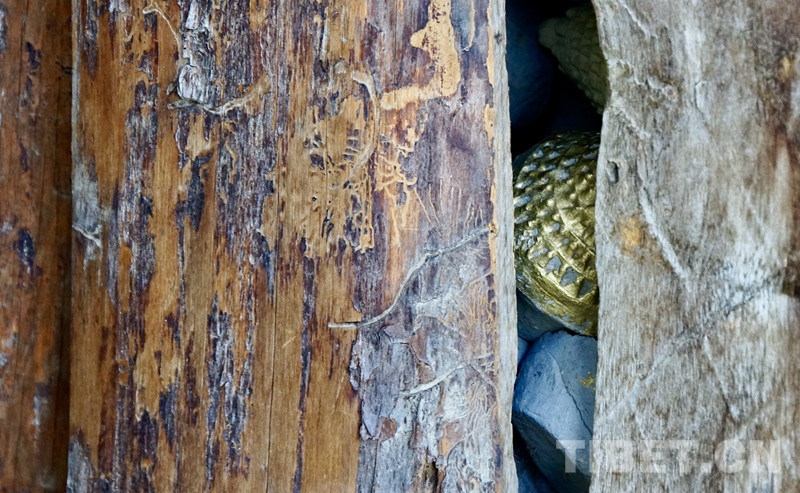 上百年的羊皮經(jīng)筒,里面裝著厚厚的一匝匝經(jīng)卷,被若干次轉(zhuǎn)動后,羊皮裂開了口子,巧手的藏族群眾用皮繩將歲月的裂口密密縫住,經(jīng)筒又可以轉(zhuǎn)繞好多年。擦康被木板封住了,小蟲在木板上啃蝕出畫作一樣的痕跡,木板縫隙中,閃耀著金色的光芒,光芒來自擦康里放置的擦塔——一個(gè)上面有著108座小塔的擦塔。