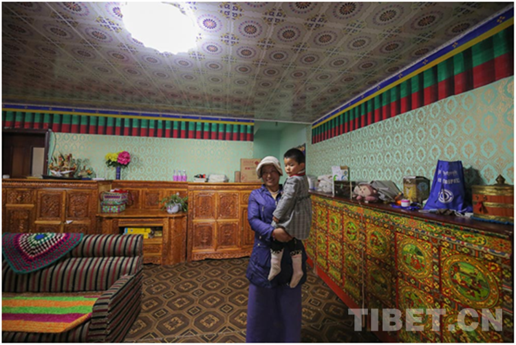 圖為扎囊縣扎其鄉(xiāng)德吉新村村民央金卓瑪和外甥在自家客廳 攝影:趙耀