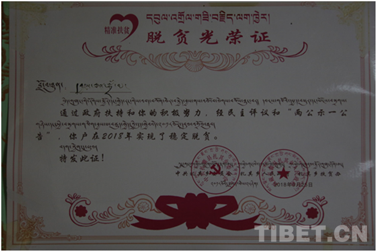 圖為扎囊縣扎其鄉(xiāng)德吉新村村民央金卓瑪家的脫貧光榮證 攝影:趙耀