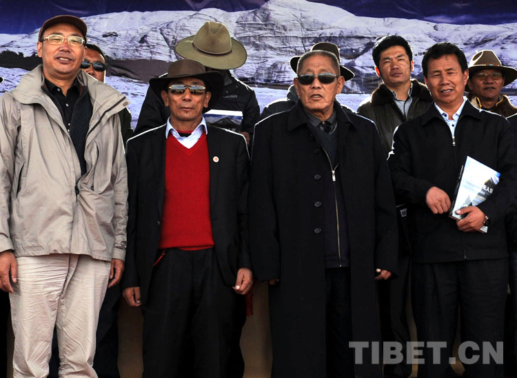 這是唐召明(左一)與雙湖縣縣委書記南培(右一)等領(lǐng)導(dǎo)在贈書儀式結(jié)束后合影留念。當(dāng)日,唐召明所著的《走遍藏北無人區(qū)》一書在雙湖縣舉行了首發(fā)和贈書儀式(唐召明提供,2013年7月27日攝)