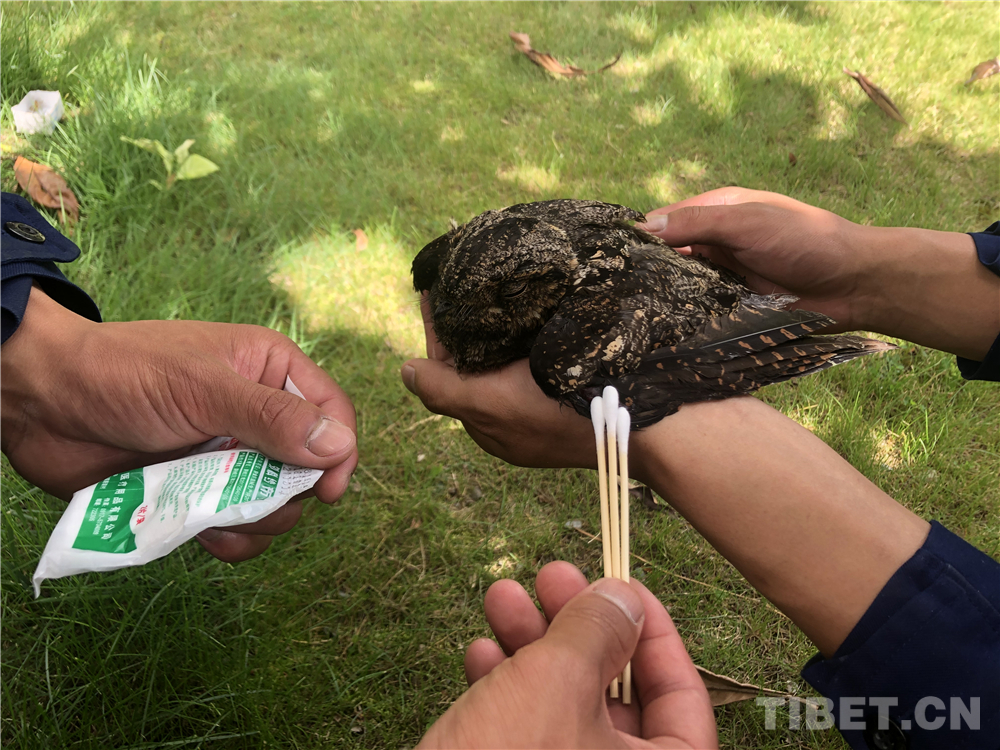 圖為“藍(lán)朋友”們?yōu)樾▲B(niǎo)包扎傷口