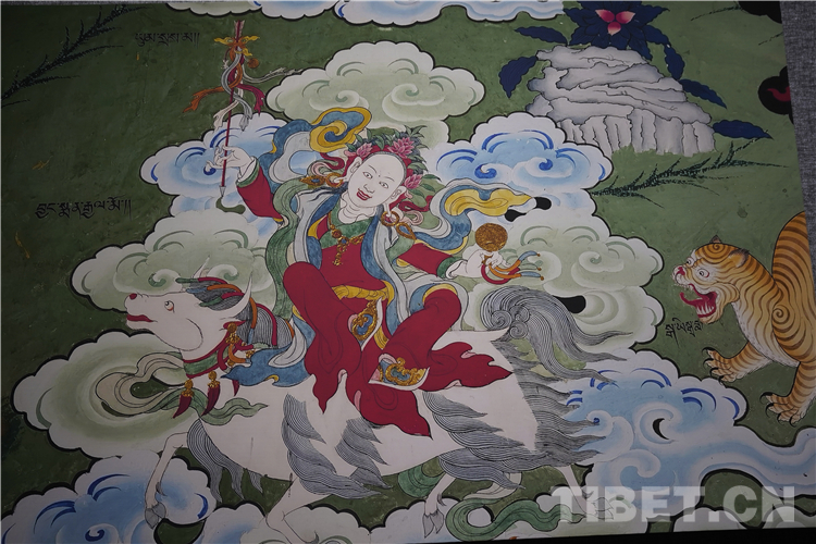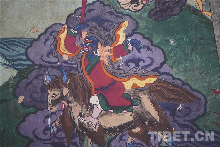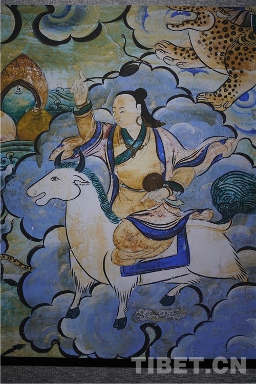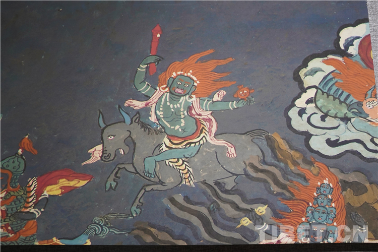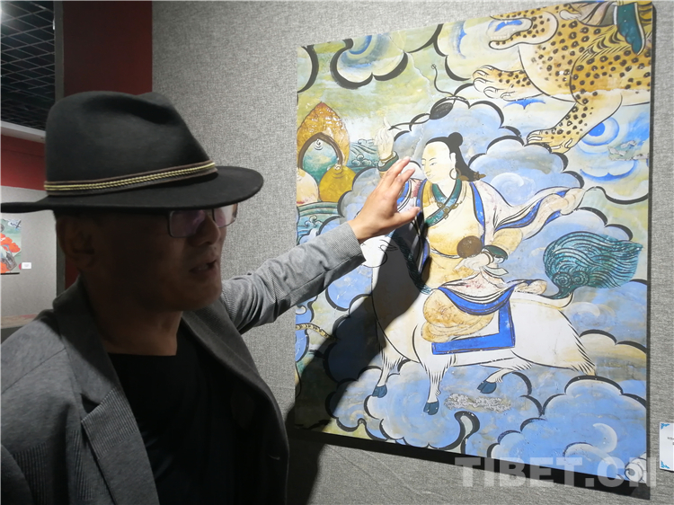 展廳中還有一副遠(yuǎn)看非常另類,細(xì)細(xì)欣賞漢藏繪畫風(fēng)格交流交融的作品,那是一幅四川省阿壩藏族羌族自治州金川縣墨爾多神山壁畫的局部作品。東智先生說:“這幅局部畫作從發(fā)髻、服飾等多個方面充滿了漢族風(fēng)格,甚至人物穿的還是漢服,座下是像馬一樣的牦牛,但是手上掄著古朵(古朵指的是用牦牛毛或者山羊毛編織成的拋石繩,可以將石頭投擲到較遠(yuǎn)的地方,是牧民們用來放牧的工具),非常有辨識度,充滿藏族文化特色?!?/p>