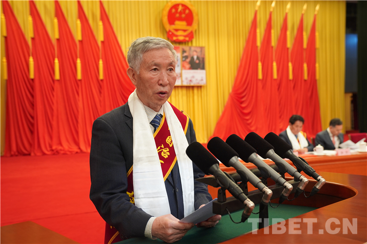 圖為2018年度西藏自治區(qū)科學(xué)技術(shù)獎突出貢獻獎獲得者劉務(wù)林發(fā)言 攝影:王淑