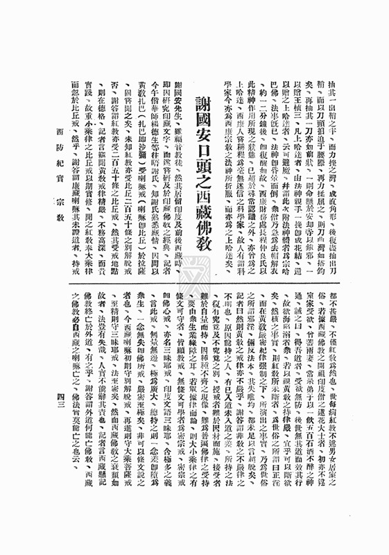 1887年,謝國安出生在今四川省甘孜縣絨壩岔。他的藏名為多吉卓巴,后因信仰基督教,取名Paul Sherap(人稱智慧保羅,我們注意到此名帶有藏文音譯),漢名謝國安。10歲時,他離開家鄉(xiāng)進入拉薩哲蚌寺學經(jīng)。不久,謝國安離開寺廟,跟隨藏商商隊去了錫金甘托克、印度大吉嶺的教會學校學習藏文、英文和梵文。后應孟加拉亞洲學會之請,到加爾各答參與校訂《藏文大藏經(jīng)·甘珠爾》。他兼通藏、英、梵三種文字,熟練地用藏、英語會話。辛亥革命爆發(fā)后,他返回內地,之后定居康定。此后一段時間在康定的國立師范學校任教,主持編寫了多部教材,如《西康國語教科書》(8冊)、《西康常識教科書》(8冊)、《西康公民教科書》等。這套教科書編輯方法,系根據(jù)教育部頒“小學課程標準”及西康特殊環(huán)境,先編漢文,再用藏文譯注,對民國時期西康教育發(fā)展和推廣起到特殊的推動作用。他曾在西康舉辦的“縣訓班”擔任藏文教員。當時著名學者李思純曾在康定見過他,印象較好,認為他“居印度甚久,故能操英語等,現(xiàn)居康定,研習藏文甚深?!?938年,著名學者柯象峰到康定一帶考察時,受到謝的熱情接待和幫助。他在日記里對謝國安頗有贊詞,10月9日的日記中提到“午時左右,謝國安君來訪,托其購佛經(jīng)數(shù)部。”幾天后謝國安即將“購得之佛經(jīng)十余部一一為之譯名及指出出版處”。