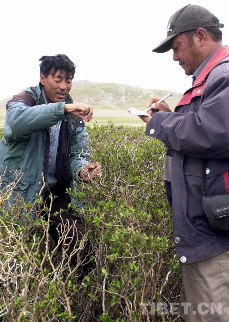 這是西藏大學(xué)化生地系副教授次仁(左)與同伴在西藏申扎縣科考中,對新發(fā)現(xiàn)的大片山柳灌木叢進行測量(唐召明2001年攝)