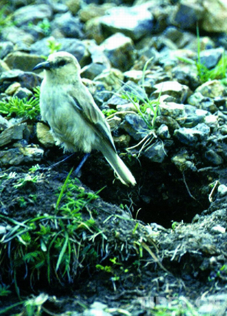 這是一只小鳥在鼠兔洞前張望。在藏北草原,鳥因無樹可棲,鳥鼠同穴現(xiàn)象十分普遍(唐召明2001年攝)