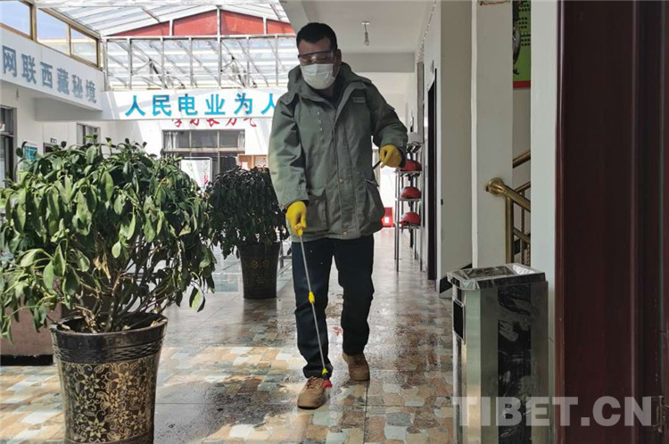 圖為嚴(yán)鋒為項目部各辦公住宿場所進(jìn)行消毒